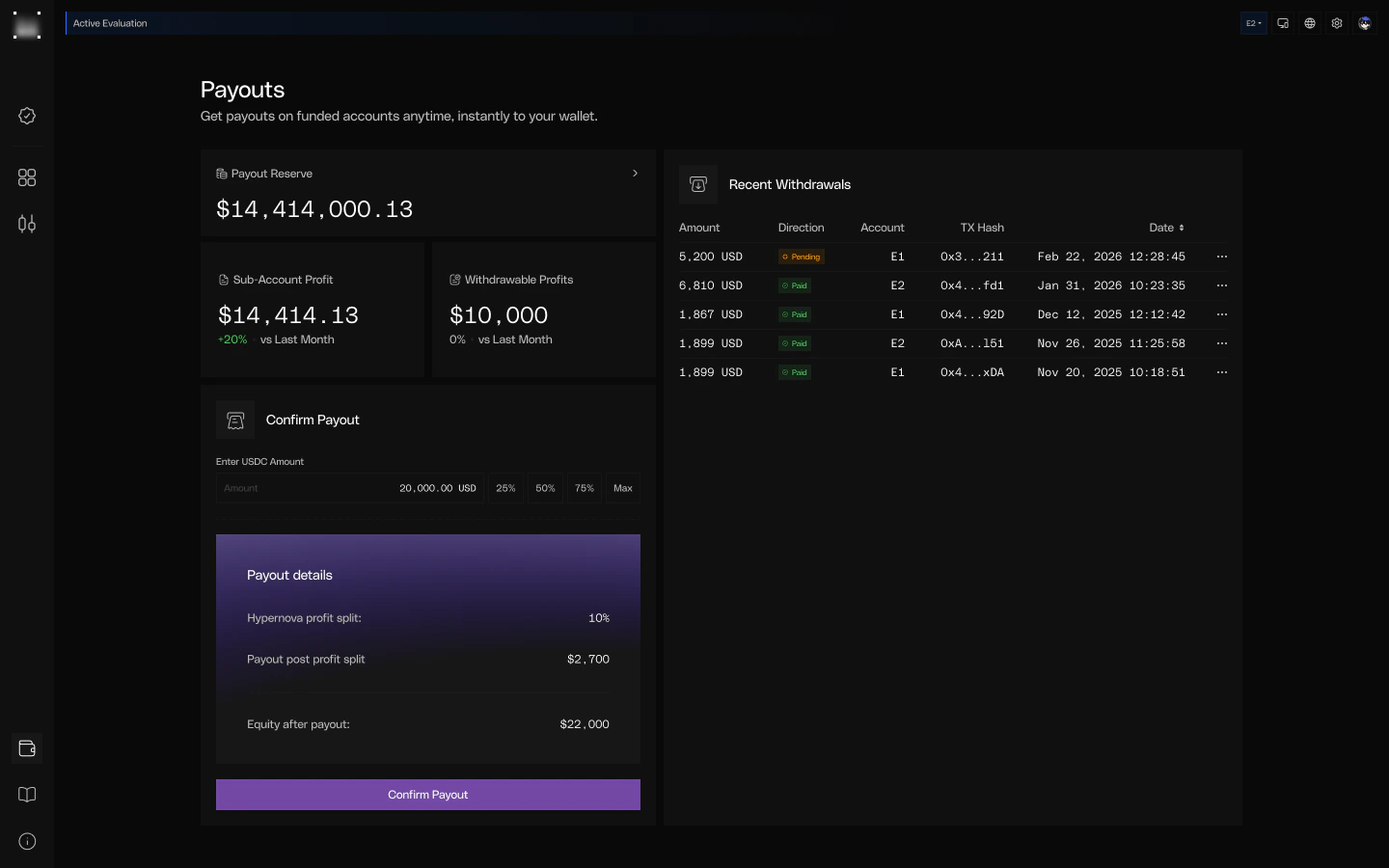 From your funded account dashboard, click Submit Payout and enter the USDC amount you’d like to withdraw. You can use the quick-select buttons (25%, 50%, 75%, Max) or enter a custom amount.